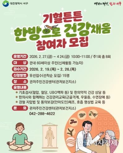 한국시사경제 의료보건팀 | 대전 서구는 이달 19일부터 ‘기혈튼튼, 한방으로 건강채움!’ 프로그램 참가자를 모집한다.