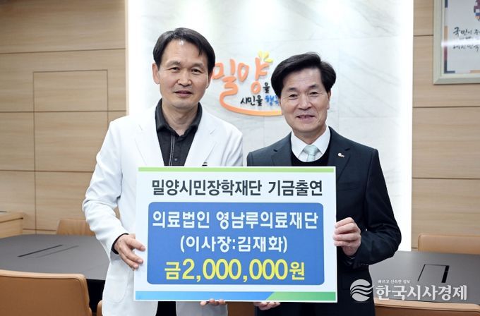한국시사경제 노승선 기자 | (재)밀양시민장학재단(이사장 안병구)은 10일 의료법인 영남루의료재단(이사장 김재화)과 대한숙박업중앙회 밀양시지부(지부장 조희선)에서 지역 교육 발전을 위한 장학기금으로 각각 200만원과 300만원을 기탁했다고 밝혔다.