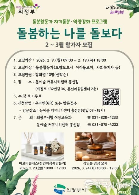 한국시사경제 경기북부취재본부 | 의정부시는 2월 9일부터 19일까지 돌봄활동가를 위한 자기돌봄·역량 강화 프로그램 ‘돌봄하는 나를 돌보다’ 2~3월 참가자를 모집한다.