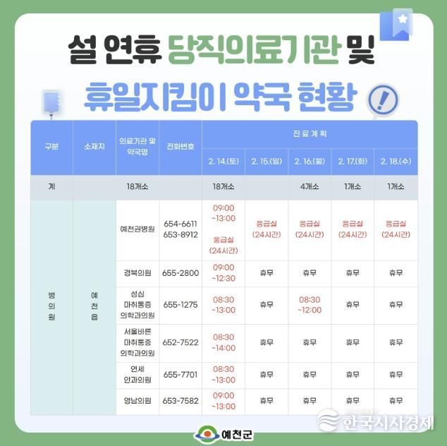 한국시사경제 노승선 기자 | 예천군은 설 연휴 동안 관내 병․의원 당직의료기관과 휴일 지킴이 약국을 운영해 진료 편의와 응급진료 서비스를 제공한다.