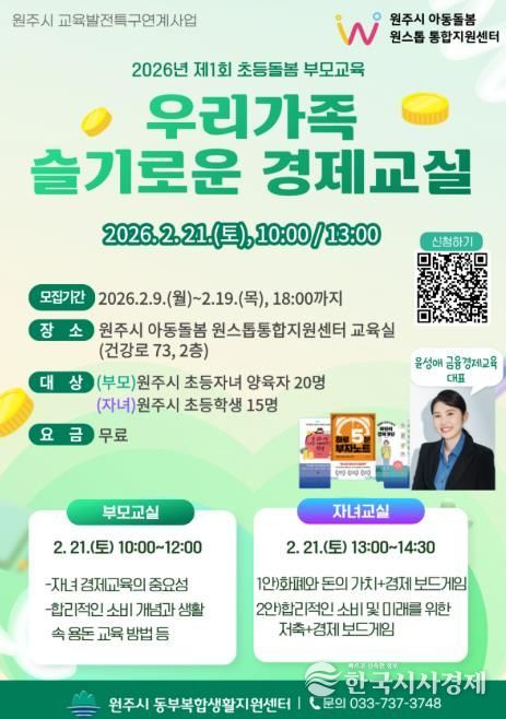 한국시사경제 권충언 기자 | 원주시 아동돌봄 원스톱통합지원센터는 2월 21일 초등생 가족을 위한 무료 경제 교육인'우리 가족 슬기로운 경제 교실'을 운영한다.