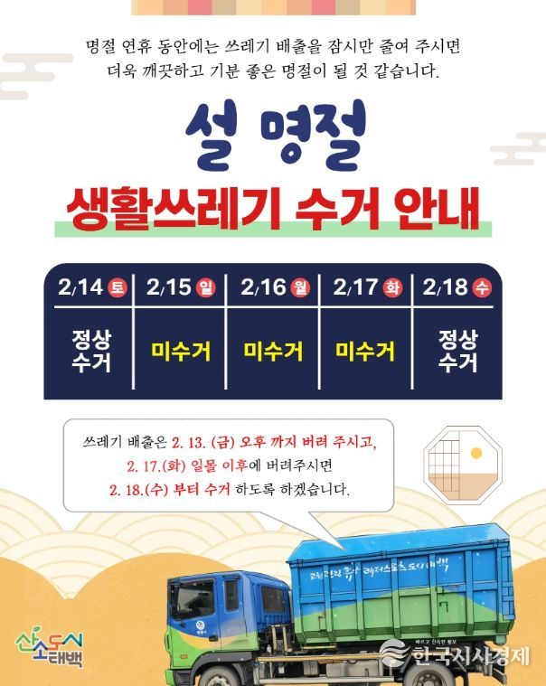 태백시는 “설 연휴 기간 중 생활쓰레기 배출은 최대한 자제하고, 반드시 지정된 수거일에 맞춰 배출해 주시길 바란다”며 “시민 여러분의 협조가 쾌적한 명절 환경 조성에 큰 도움이 된다”고 당부했다.