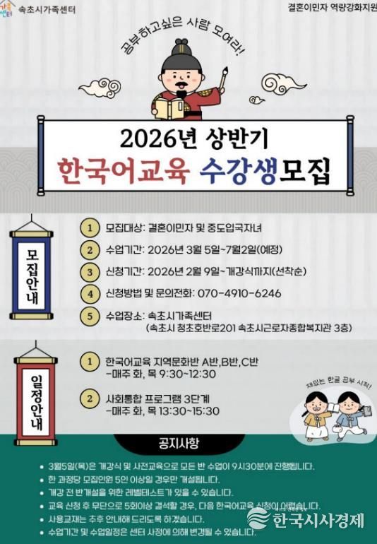 한국시사경제 권충언 기자 | 속초시가족센터가 속초시에 거주하는 결혼이민자의 지역사회 정착과 자립을 돕기 위해 상반기 한국어 교육과 운전면허 취득 지원사업 참여자를 모집한다.