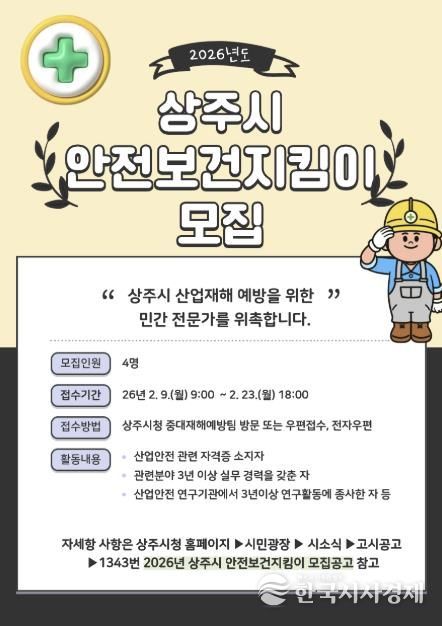 한국시사경제 경북취재본부 | 상주시는 2월 9일부터 23일까지 상주시 발주공사 사업장에 대한 산업재해 예방활동을 강화하고자 ‘안전보건지킴이’를 모집한다.