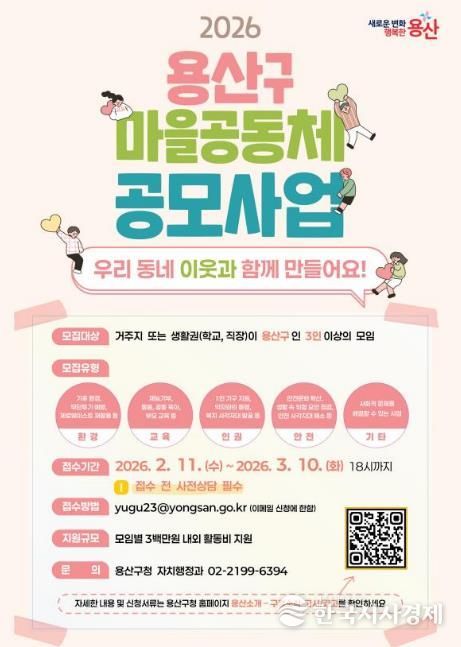 한국시사경제 노승선 기자 | 서울 용산구는 주민 주도의 지역 문제 해결을 지원하기 위해 ‘2026년 용산구 마을공동체 공모사업’ 참여자를 모집한다.