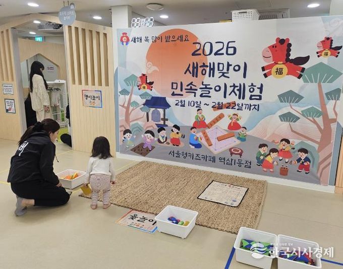 설맞이 프로그램은 역삼1동점에서 진행한다. 민속놀이존에서는 윷놀이와 사방치기 등 전통놀이를 아이들이 직접 체험할 수 있도록 구성했다. 전통 혼례를 주제로 한 특별 프로그램도 같은 기간 운영해, 겨울철 실내 놀이에 명절 분위기와 문화 체험 요소를 더했다.