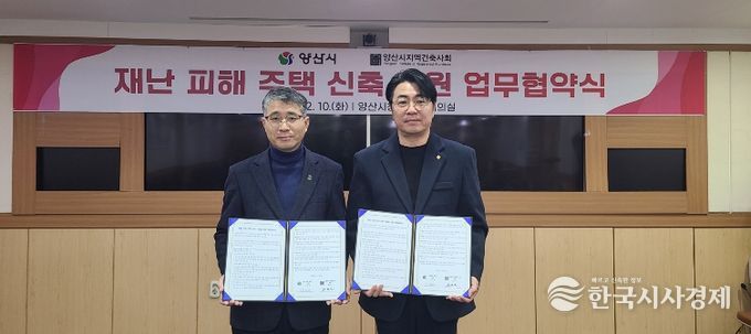 한국시사경제 노승선 기자 | 양산시는 지난 10일 시청 소회의실에서 양산시지역건축사회와 함께 '재난피해주택 신축 지원을 위한 업무협약'을 체결했다.