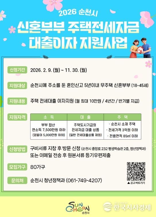 한국시사경제 문화팀 | 순천시는 신혼부부 청년들의 주거비 경감을 위해 ‘2026년 신혼부부 주택전세자금 대출이자 지원사업’ 신규 대상자를 모집하고 있다.