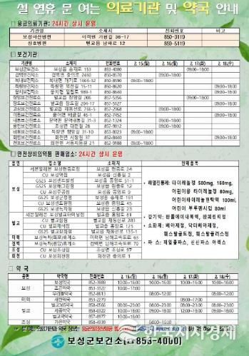 한편, 설 연휴 기간 시설 운영 및 휴관 정보는 보성군청 누리집에서 확인할 수 있으며, 생활 불편 사항은 종합상황실 및 읍면사무소(행정복지센터)로 문의하면 된다.