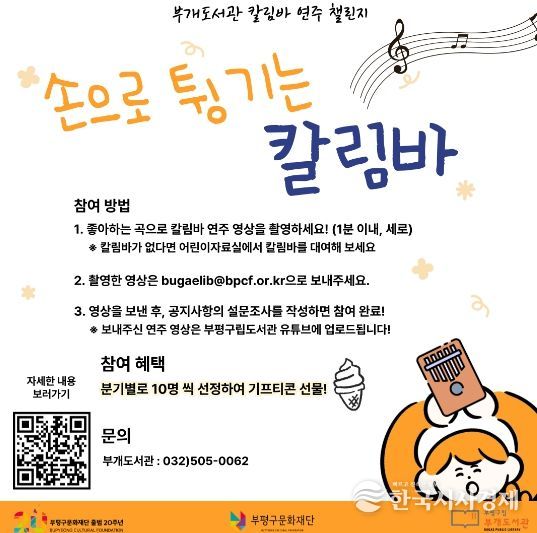 이 프로그램은 누구나 쉽게 연주할 수 있는 악기 칼림바(손가락 피아노)를 활용한 참여형 음악 프로그램으로, 참여자는 간단한 연주 영상을 촬영해 응모할 수 있다. 접수된 영상은 부평구립도서관 온라인 영상 채널에 게시되며, 추첨을 통해 참여자에게 소정의 사은품이 제공된다.