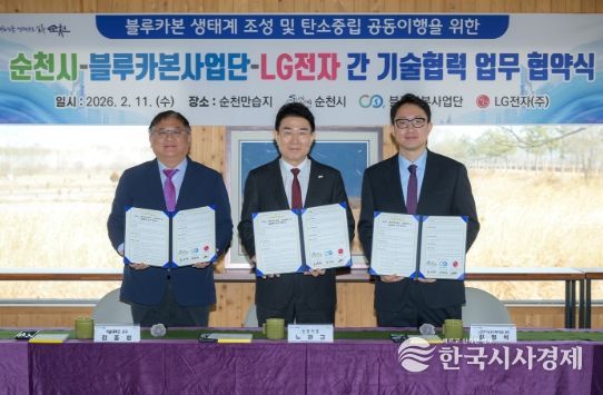 한국시사경제 전남취재본부 | 순천시는 11일 순천만습지에서 서울대 블루카본사업단, LG전자(주)와 함께 '블루카본 생태계 조성 및 탄소중립 공동 이행을 위한 업무협약'을 체결했다고 밝혔다.