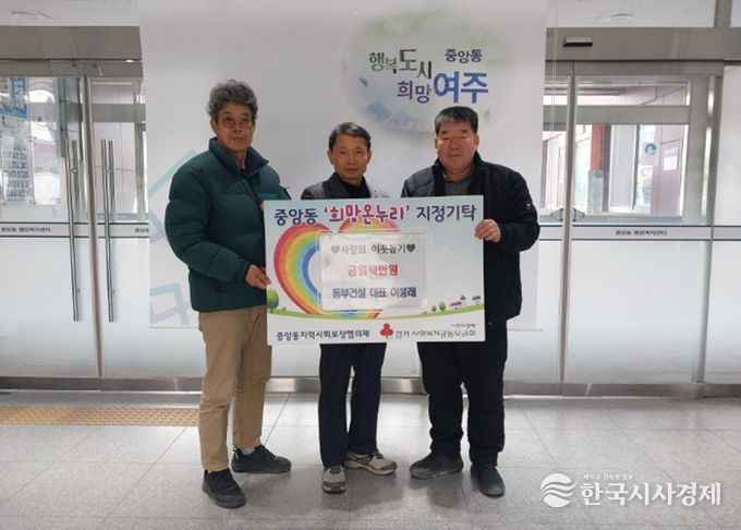 한국시사경제 기동취재팀 | 여주시 천송동에 위치한 동부건설㈜은 지난 10일 중앙동행정복지센터에 성금 100만원을 기탁하며 지역사회에 따뜻한 나눔을 실천했다.