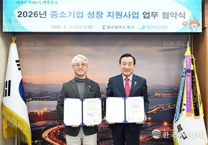 한국시사경제 울산취재본부 | 울산 북구는 11일 구청장실에서 울산테크노파크와 2026년 중소기업 성장 지원사업 업무협약을 체결했다.