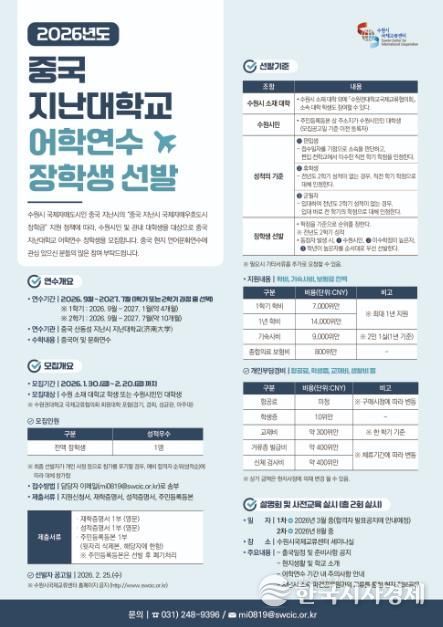 한국시사경제 사회팀 | 수원특례시는 2월 20일까지 ‘2026년도 지난대학교 어학연수 장학생 프로그램’ 참가자 1명을 모집한다.