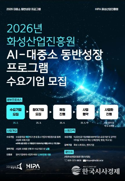 한국시사경제 경제팀 | 화성산업진흥원은 AI 기술 사업화 협력을 통해 산업 전반의 경쟁력을 높이기 위해 오는 2월 25일까지 ‘2026년 AI-대중소 동반성장 프로그램’ 수요기업을 모집한다고 밝혔다.