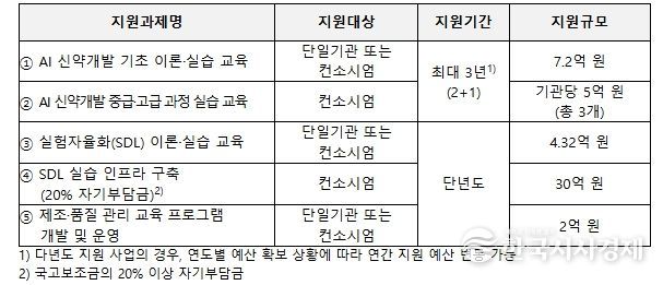 이번 공모를 통해 최대 7개 수행기관을 선정하며, 지원기간은 과제별로 구분하여 지원한다. 지원과제는 AI 신약개발 기초 이론·실습 교육, 중급·고급 과정 실습 교육, 실험자율화 이론·실습 교육, 실험자율화 실습 인프라 구축, 제조·품질 관리 교육까지 총 5개 단위이다.