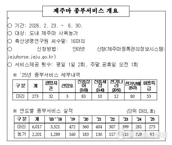 서비스는 평일에는 오전·오후 각 1회, 주말 및 공휴일에도 오전 1회 제공된다. 농가 편의를 위해 전담직원을 배치하고 제주마의 발정 시기에 맞춰 운영한다.