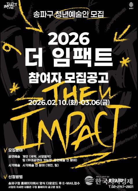 한국시사경제 이정이 기자 | 서울 송파구는 재능 있는 청년예술인을 발굴·지원하는 ‘2026 더 임팩트’ 참가자를 오는 3월 6일 오후 5시까지 모집 중이라고 23일 밝혔다. 이번 공모는 지난 2월 10일부터 접수가 진행되고 있다.