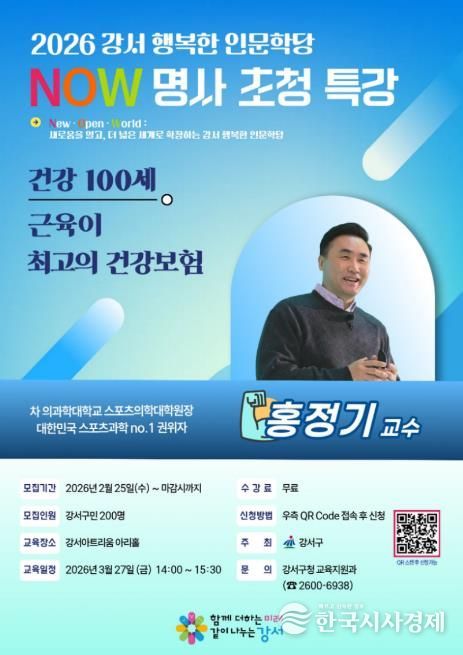 한국시사경제 기동취재팀 | 서울 강서구는 구민의 삶의 질을 높이고 건강한 일상을 돕기 위해 3월 27일(금) 오후 2시부터 3시 30분까지 강서아트리움(가로공원로 195)에서 명사초청 강의를 개최한다.