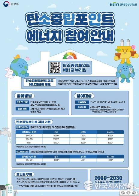 에너지 절감과 자동차 운행거리 절감으로 나눠 각각 보상금을 지급하며, 탄소중립포인트(에너지, 자동차) 누리집을 통해 참여가 가능하다.