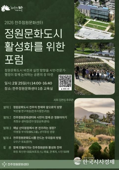 전주시 관계자는 “기후 위기와 정서적 고립이 깊어지는 시대에 이번 포럼을 통해 시민 삶의 질 향상을 위한 정원의 공공적 가치를 널리 알리고, 일상 속 정원 지향적 공간 활용을 지속해서 확대할 예정”이라고 말했다.