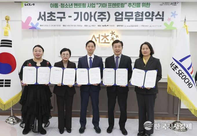 한국시사경제 이정이 기자 | 서울 서초구가 24일 기아㈜와 함께 저소득 아동·청소년의 교육 격차 해소와 건강한 성장을 지원하는 멘토링 사업 ‘기아 프렌토링’ 추진을 위한 업무협약을 체결했다고 밝혔다.