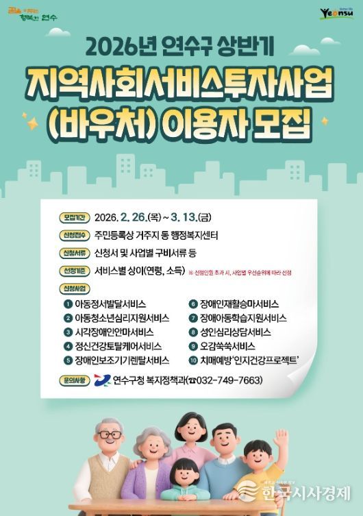 한국시사경제 문화팀 | 연수구는 오는 26일부터 다음 달 13일까지 ‘2026년 지역사회서비스투자사업’의 이용자 1천 명을 모집한다.