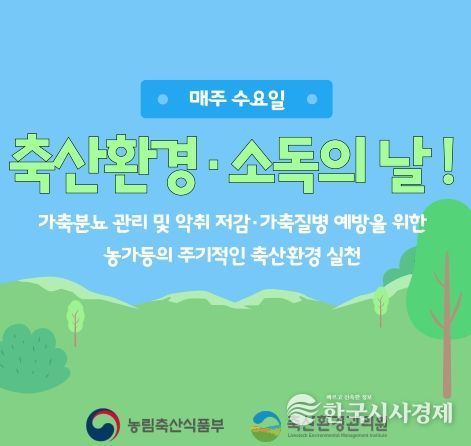 한편, 농림축산식품부는 매주 수요일을 ‘축산환경·소득의 날’로 지정하여 축산농가와 관련 시설이 소독, 청소 및 구서(쥐를 잡아 없애는 일), 구충 방제 등 축산환경 개선 활동을 실천할 수 있도록 독려하고 있으며, 자율적인 참여 분위기 조성을 통해 쾌적한 축산환경 조성에 힘쓰고 있다.
