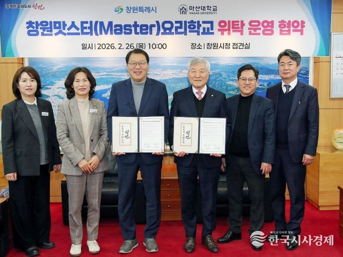 한국시사경제 경제팀 | 창원특례시는 2월 26일 시청 접견실에서 마산대학교와 '창원맛스터(Master)요리학교 위탁운영 업무협약'을 체결하고, 향후 3년간 지역 외식업 경쟁력 강화를 위한 전문인력 양성 사업을 추진한다.