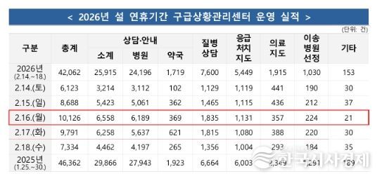 한국시사경제 오영주 기자 | 소방청은 2026년 설 연휴 기간(2.14.~2.18., 5일간)전국 총 45,082건의 구급 출동으로 24,166명을 이송하였으며, 구급상황관리센터에서 총 42,062건의 상담을 실시했다고 밝혔다.