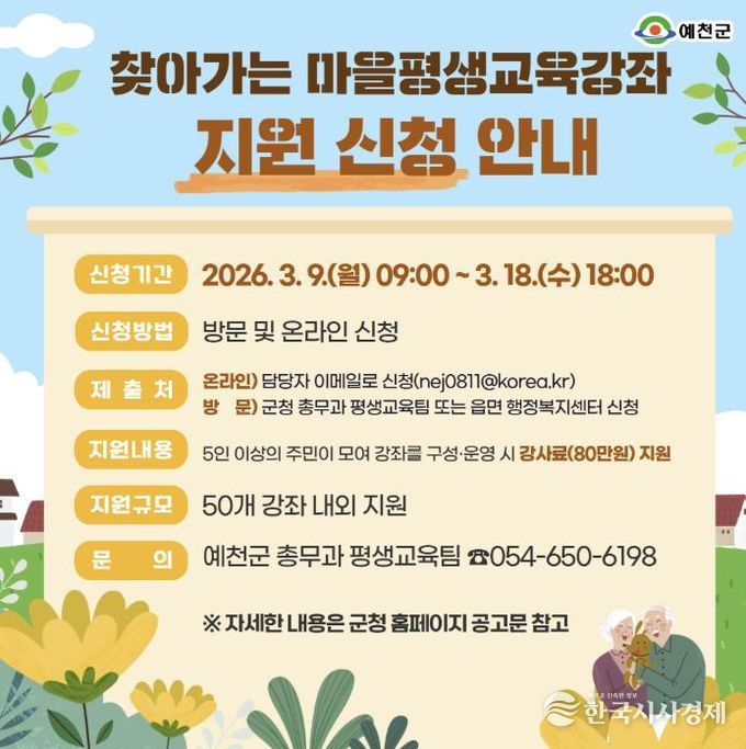 한국시사경제 노승선 기자 | 예천군은 3월 9일부터 3월 18일까지 2026년 ‘찾아가는 마을평생교육강좌’ 참여 희망자를 모집한다.