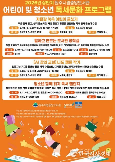 한국시사경제 권충언 기자 | 원주시립중앙도서관은 오는 3월부터 6월까지 ‘2026년 상반기 어린이 및 청소년 독서문화 프로그램’을 운영한다.