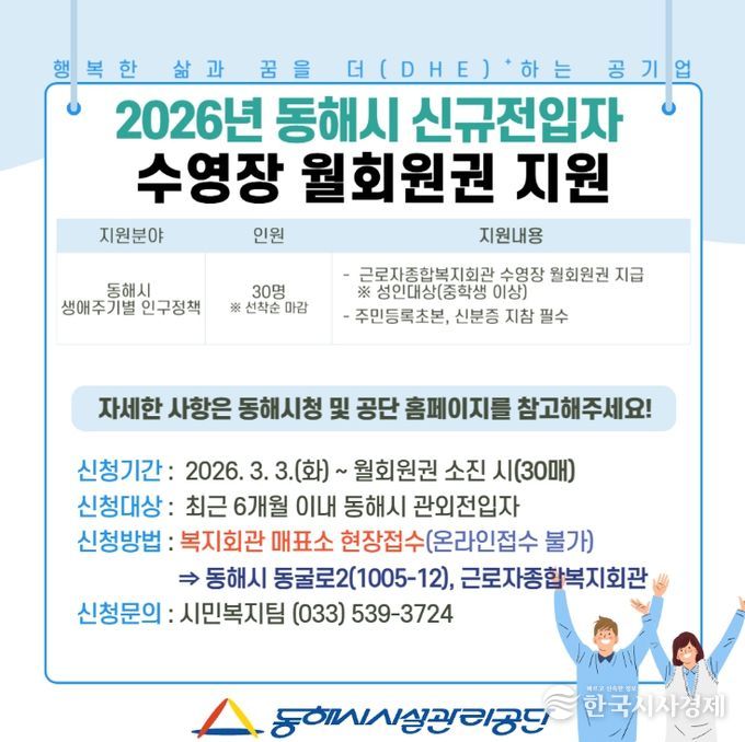 이번 수영장 월회원권 지원은 동해시 생애주기별 인구정책의 하나로, 동해시시설관리공단이 지방공기업으로서 시민 건강 증진과 신규 전입자 정착을 지원하기 위해 마련한 신규 인구정책지원 사업이며, 최근 6개월 이내 동해시 관외 전입자를 대상으로, 오는 3월 3일부터 시행한다.