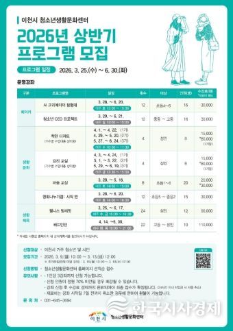 한국시사경제 이정이 기자 | 이천시 청소년생활문화센터가 청소년과 지역주민의 건강한 생활문화 형성과 역량 강화를 위해 ‘2026년 상반기 프로그램’을 운영하고 수강생을 모집한다고 밝혔다.