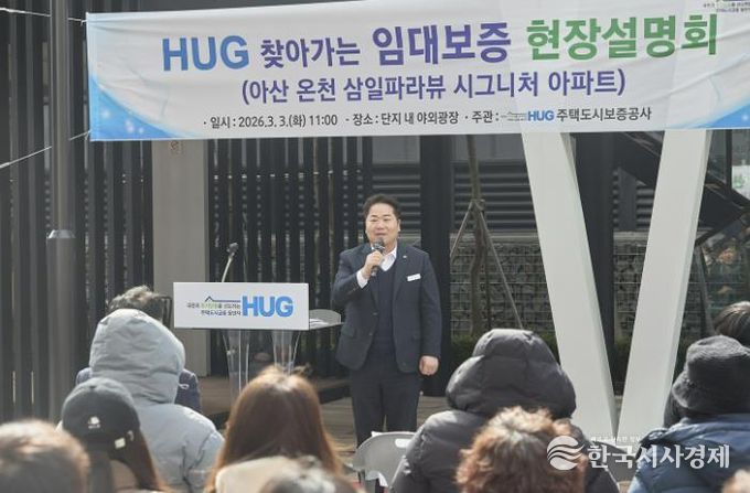 한국시사경제 충남취재본부 | 아산시는 3일 온천동 삼일파라뷰 시그니처 단지 내 광장에서 주택도시보증공사(HUG)와 함께 임대보증금 보증이행 관련 현장설명회를 열고 임차인 보호 대책과 향후 절차를 안내했다.