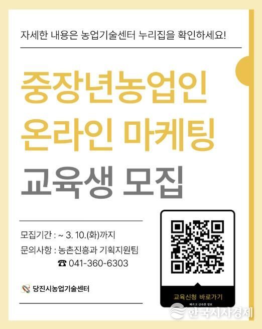 한국시사경제 충남취재본부 | 당진시는 농산물 온라인 판로 확대와 디지털 역량 강화를 위해 ‘중장년농업인 온라인 마케팅 교육’ 교육생을 모집한다고 4일 밝혔다.