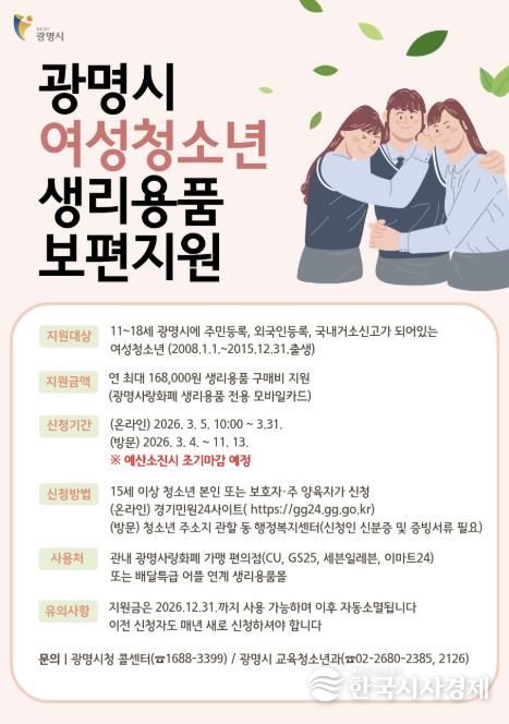 한국시사경제 경기취재본부 | 광명시가 4일부터 청소년의 건강권과 인권 보장을 위해 ‘여성청소년 생리용품 보편지원 사업’ 신청을 받는다.