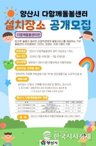 한국시사경제 노승선 기자 | 양산시는 오는 20일까지 초등학교 정규교육 이외의 시간 동안 돌봄서비스를 제공하기 위한 ‘양산시 다함께돌봄센터’의 설치장소를 공개모집 한다.