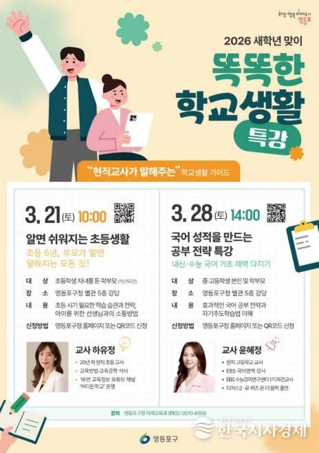 한국시사경제 기동취재팀 | 영등포구가 새 학년을 맞아 초‧중‧고등학생과 학부모를 대상으로 ‘똑똑한 학교생활 특강’을 운영한다. 학생들의 원활한 학교 적응과 효과적인 학습 준비를 돕기 위해 마련된 프로그램이다.