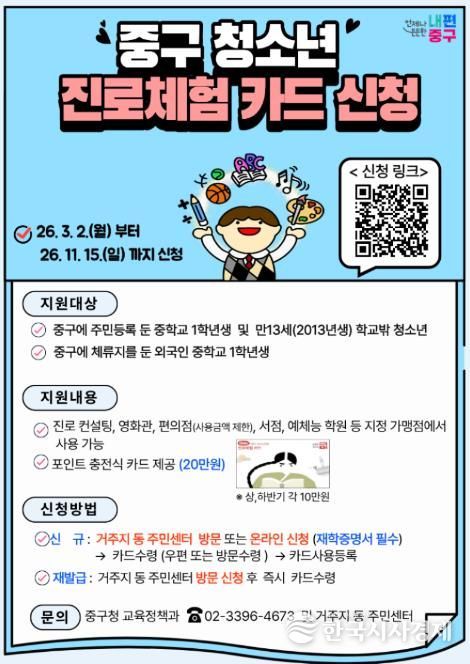 구 관계자는 "중구는 경제적 여건과 관계없이 모든 아이들이 스스로의 꿈을 찾을 수 있도록 지원하고 있다"며 "진로체험카드가 우리 청소년들에게 더 넓은 세상을 경험하고 미래를 설계하는 든든한 디딤돌이 되길 바란다”고 전했다
