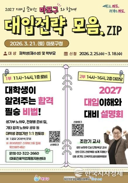 한국시사경제 노승선 기자 | 마포구는 3월 21일 마포구청에서 수험생과 학부모를 위한 ‘2027학년도 대입 전략 설명회 및 진학 멘토링’을 개최한다.