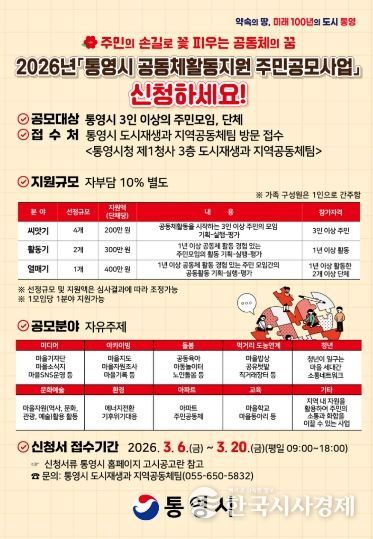 한국시사경제 경남취재본부 | 통영시는 주민 스스로 계획하고 공동체적 방식으로 추진하는 활동을 지원하기 위해 2026년'통영시 공동체활동지원 주민공모사업'에 참여할 공동체를 오는 6일부터 20일까지 모집 접수한다.