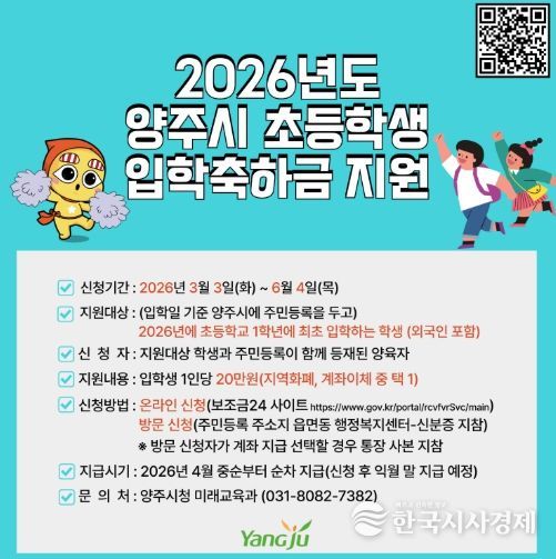 한국시사경제 문화팀 | 양주시가 지역 내 초등학교 1학년에 입학하는 신입생 가정의 교육비 부담을 경감하고 교육복지 실현을 위해 ‘2026년 초등학교 입학축하금 지원사업’을 추진한다.