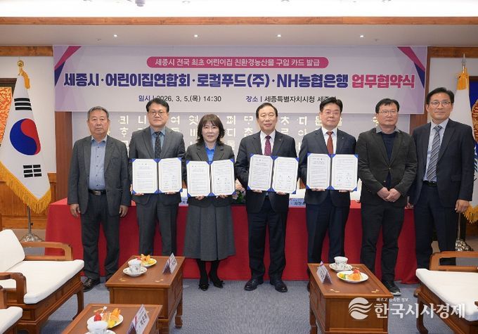 시는 5일 시청 세종실에서 세종시어린이집연합회, 농업회사법인 세종로컬푸드주식회사, NH농협은행세종본부와 ‘어린이집 친환경급식 지원체계 구축’을 위한 업무협약을 체결했다.