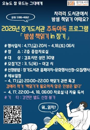 한국시사경제 윤광희 기자 | 김포시 장기도서관은 시민들이 책과 함께 특별한 밤을 보낼 수 있도록 오는 4월 17일 오후 8시부터 다음날인 4월 18일 오전 6시까지 도서관에서 자율적으로 독서를 하는 '밤샘 책읽기 인(in) 장기' 프로그램을 진행한다.