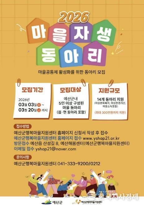 한국시사경제 충남취재본부 | 예산군행복마을지원센터는 마을에 활력을 불어넣고 마을공동체 회복을 도모하기 위해 2026년 마을자생동아리를 3월 20일까지 모집한다고 밝혔다.