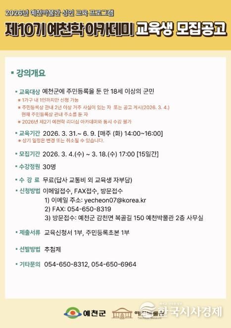 한국시사경제 노승선 기자 | 예천군은 2026년 상반기 ‘예천학 및 예천학 리더십 아카데미’ 교육생을 18일까지 모집한다.