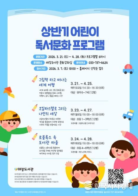 한국시사경제 권충언 기자 | 원주시 태장도서관은 3월부터 4월까지 관내 유아와 아동을 대상으로 ‘2026년 상반기 어린이 독서문화 프로그램’을 운영한다.