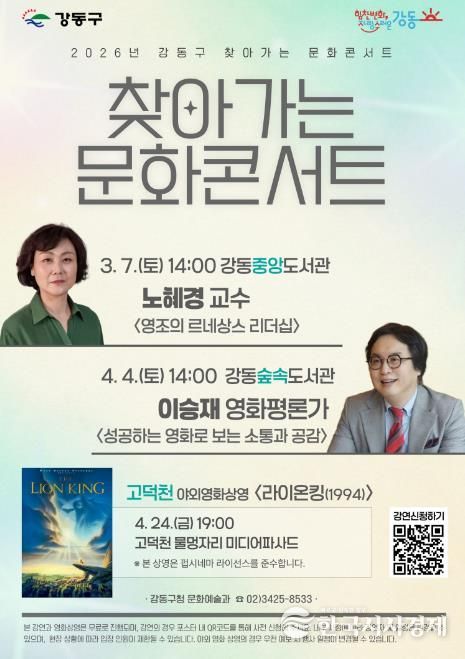 한편, '찾아가는 문화콘서트' 2회차는 오는 4월 4일 강동숲속도서관에서 열릴 예정이며, 영화평론가 이승재가 ‘성공하는 영화로 보는 소통과 공감’을 주제로 강연을 진행한다. 구는 다양한 분야의 전문가를 초청해 인문·예술 프로그램을 꾸준히 선보일 계획이다.