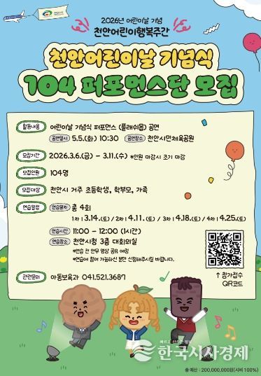 한국시사경제 충남취재본부 | 천안시는 제104회 어린이날을 맞아 기념식 무대를 함께 꾸밀 ‘104 퍼포먼스단’을 모집한다고 6일 밝혔다.